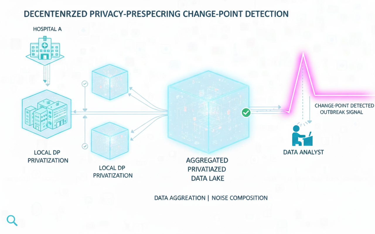 In cryptography, using MEC during the encryption process allows to achieve a perfectly secure steganography. Other examples, where this problem is of interest, include optimal transport, dimensionality reduction, random number generation, etc. As simple as the problem looks, solving it is deceptively difficult. The problem of finding the MEC is NP-Hard, i.e., no polynomial-time algorithm exists that can output the optimal coupling, say ![]() First, we derive an easily computable function that gives an information-theoretic lower bound on the entropy of the optimal coupling, i.e., Eq. . Then, we analyze a greedy-coupling algorithm and show that it outputs a coupling whose entropy is within (where approx. and approx. for ) bits of the lower bound, i.e., Eq. . Together with Eq. and , we show that the entropy of is close to the optimal solution. Moreover, we prove our results for a broader class of entropies, namely the Rényi entropy of any order . Our analysis shows that the greedy-coupling algorithm is optimal for infinite-order Rényi entropy , i.e., . Note that .A related setting where the MECs show up is the Efficient Functional Representation of Information (EFRI). Given two correlated random variables ![]() Privacy-preserving Inference of Shifts in InformationConsider a scenario where the hospitals provide the city health office with daily patient-admission records. The objective is to detect an outbreak of a disease by tracking the admissions at the hospital for designated symptoms or diagnoses, and identifying statistically significant shifts in incidence. To achieve timely and reliable detection, the health office must deploy scalable algorithms that can detect changes in the available information with high accuracy and low detection delay, without raising false alarms. This process of inferring changes in the underlying information is commonly known as Change-Point Detection (CPD). CPD is a widely studied concept in statistical theory with the goal of detecting and estimating the change point in a time series of data under the accuracy-latency tradeoff. Depending on how the data is available, i.e., in batches (offline data) or a sequential time-series (online data), or if the data is hypothesized to be sampled from a population or otherwise (parametric vs non-parametric setting), several task-aware CPD algorithms have been studied in the literature. They are widely used for monitoring the stock market, IoT-based surveillance, traffic and mobility, e-commerce, supply chains, etc. During my internship at the Nokia Bell Labs, we designed non-parametric CPD algorithms for in-vivo health monitoring in a Passive Optical Network. These methods support early detection of communication-link quality degradations and facilitate their root-cause identification. ![]() With the growing concerns regarding the misuse of personal data in today’s era, it is often undesirable to disclose sensitive information directly to the data analyst. This motivates the study of CPD in a privacy-preserving manner. We employ the notion of Differential Privacy, which is widely adopted in industry. We focus on studying fundamental limits and designing CPD algorithms under differential privacy, where the sensitive data is privatized at the source before being shared with the data analyst for the estimation of the change-point. Apart from the latency constraint, this framework introduces an added privacy constraint. Thus, our current work involves designing differentially private CPD algorithms, studying their accuracy-latency-privacy tradeoffs, and quantifying the cost of privacy. ![]() Undergraduate Research SummaryInformation-theoretic Cryptography